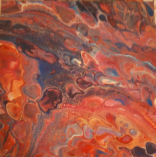 When I was preparing my first exhibition, I had made more than 80 paintings at that point, but didn’t have a fantastic large canvas until this one literally poured out of me. Using 5 flip cups and 10 different paints this canvas is covered in mixed tints and metallics, multi-colored cells, and gorgeous lacing! One of my favorite pieces in the 2020 collection.