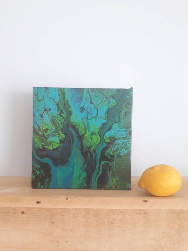 After finishing "Frond" I had leftover greens and blues, so I decided to do a flip cup on a small canvas and this is the result! Beautiful and fascinating, this small canvas makes a big impact!