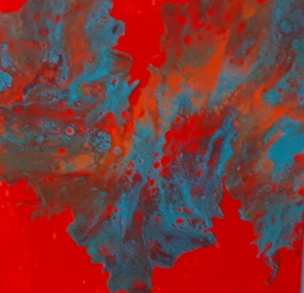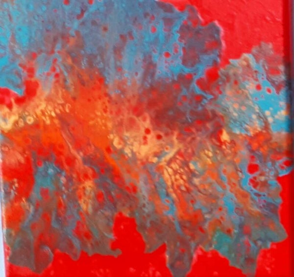 These three Acrylic Pour paintings hung together create a larger piece featuring colorful splashes against a hot red background. They are sold only as a set.