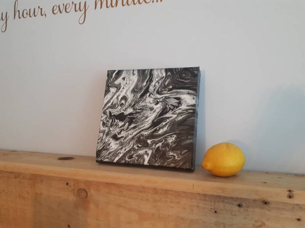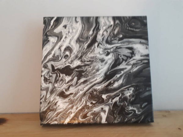 When doing an acrylic pour, black and white usually mix, instantly making a muddy grey--but using a new technique these contrasting shades kept separate on this eye-catching canvas.