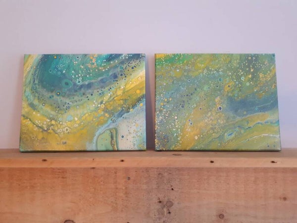 Light, refreshing droplets of rain dance across the surface of this spring-colored canvas. Poured at the same time as "April Shower", these pieces compliment each other perfectly. Though I didn't connect them in a series, a discount can be arranged for the purchase of both pieces together.