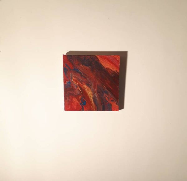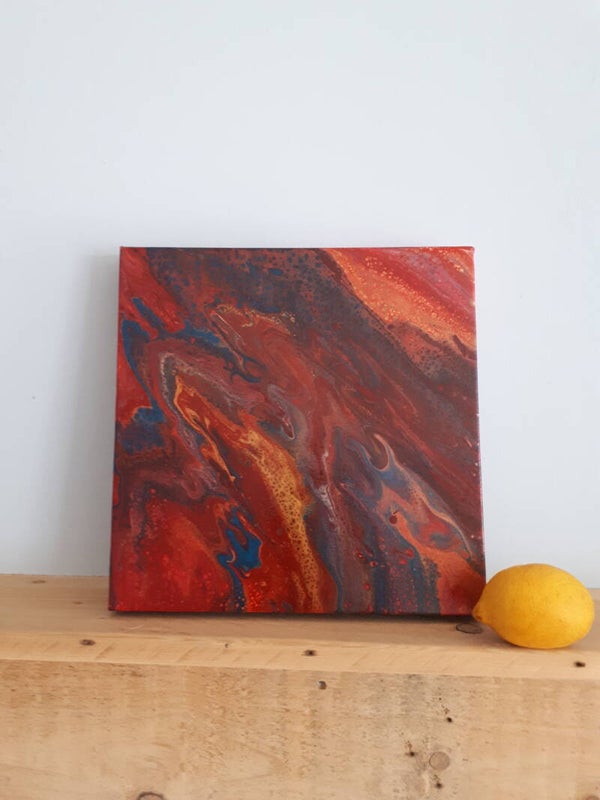 After pouring “Flow”, I had enough gorgeous paint to make another piece…and once again the colors came together beautifully with fantastic splashes of fiery color and metallics!