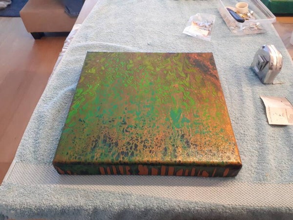 As this beautiful swipe piece was drying, it was almost the exact opposite of the chemical process known as oxidation. When the paint was still wet the canvas was predominantly green, but over the course of a few days the copper and bronze colors began to take over until they finally settled into this shiny and organic statement piece.
