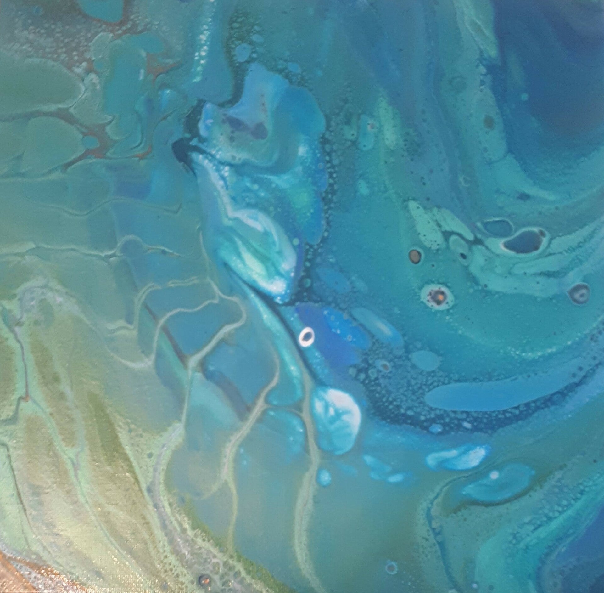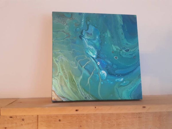 Sometimes tilting a canvas for too long can ruin the cells and create a very splotchy piece, but in this case the lacing left behind an image reminiscent of the inside of an abalone shell. I continue to be a fan of ocean palettes and this painting is no exception.