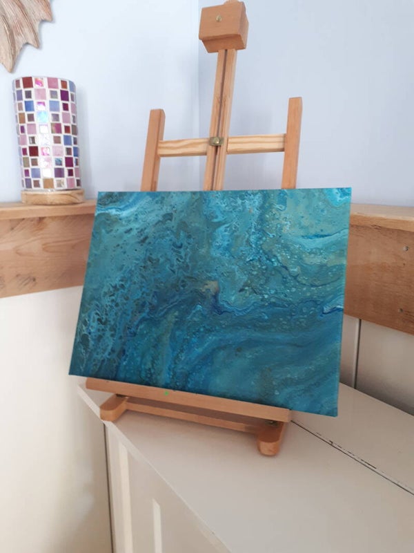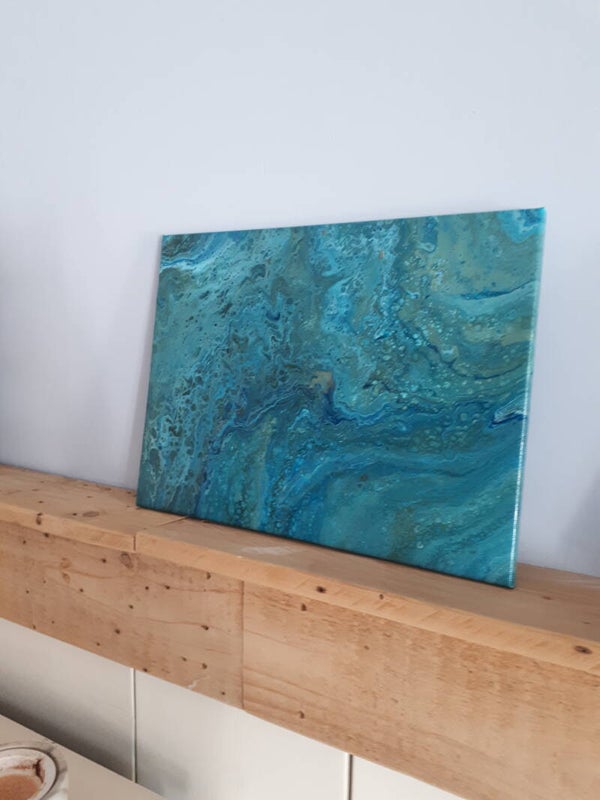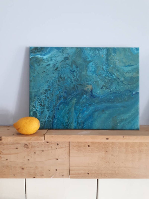 Though I've made paintings using colors all across the spectrum, I continually turn to shades of blue and find my inspiration in the sea. This canvas reminds me of the oceans seen from high above the Earth; specks of gold reflecting off the surface.