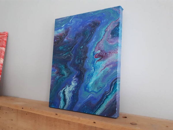 "Frozen" was playing in the background and I saw the colors of Queen Elsa's coronation dress and the one she creates. Frosty and bright blues and whites, rich purple and gorgeous teal--I wondered what they would look like together on a canvas and this is the result. Buy this painting and you will never "Let it Go"...