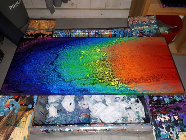 Having done several rainbow swipes, I decided to try one on a large canvas but this time, I reversed the order of the colors and started with purple at the top instead of red as I had always done in the past. The result is this "backwards rainbow" which is also the inspiration for this pieces name.