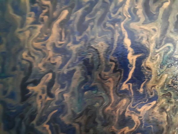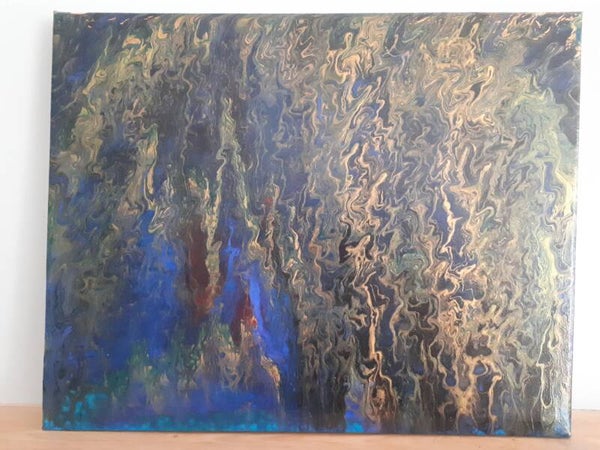 Something blue and violet is shimmering in the distance...but it's hard to see through the liquid gold dripping down in the foreground. Beautiful colors and dynamic gold squiggles make this piece a feast for the eyes.