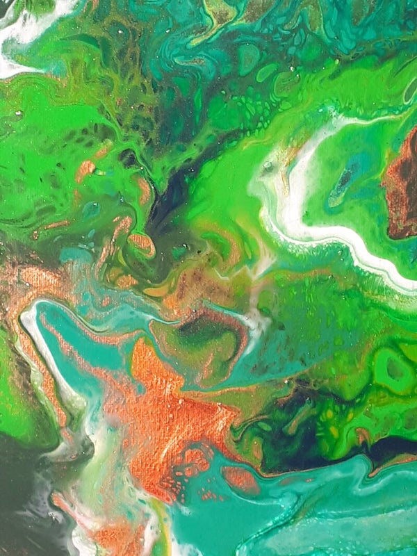 A variety of greens fight for superiority on this canvas while copper and white subtly draw your attention away from their fight. It's enough to make them green with envy!