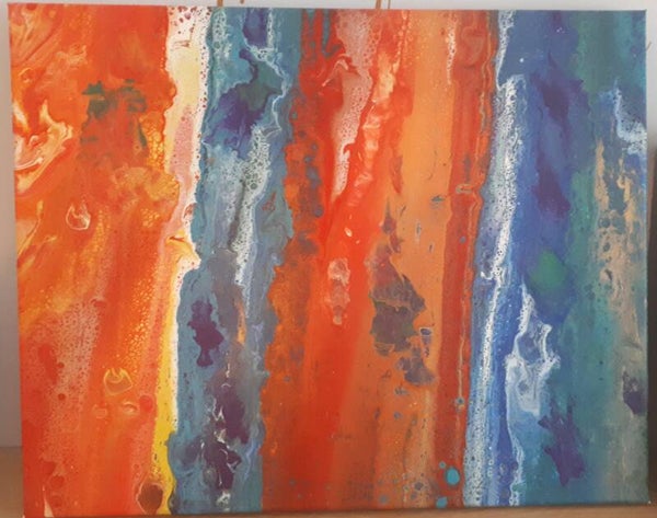 My Rainbow paintings are usually very bright, but this one seems more muted as the normally strong primary colors of red, yellow and blue take a backseat to orange, green and purple.