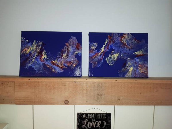 A gold, lavender, maroon and burgundy "flow" snakes it's way across these two indigo colored panels. Made on 3D canvases, the painting continues onto the sides of the pieces making it a beauty from any angle.