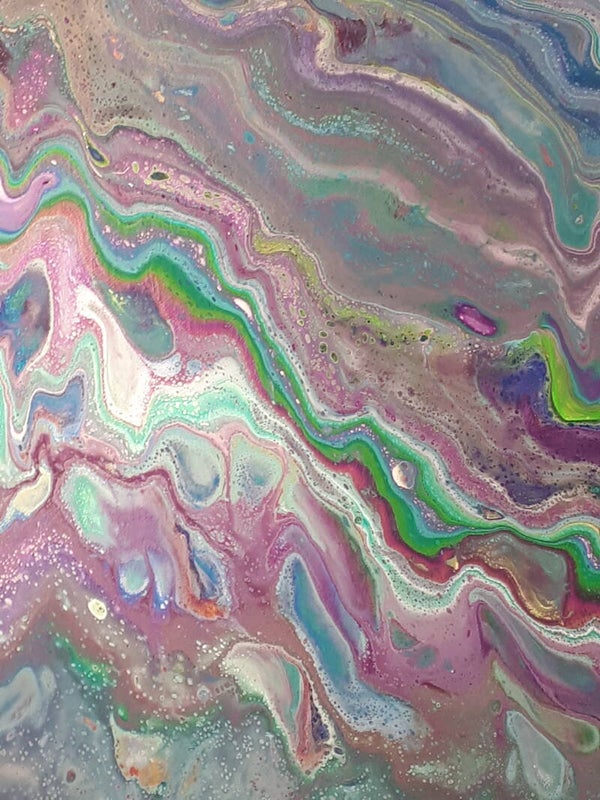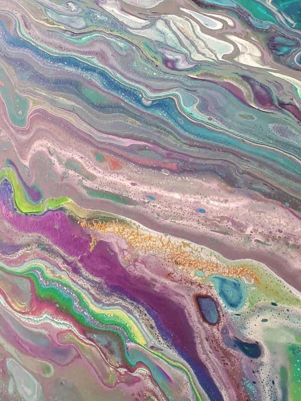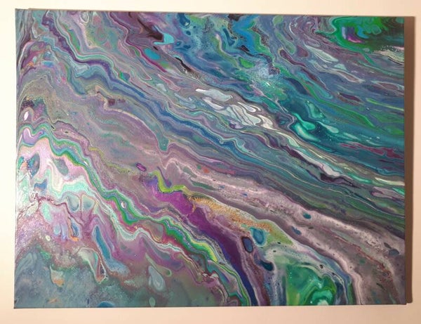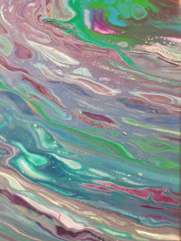 Purple and Green metallics flow in insane waves across this crazy canvas. The beauty and the busyness of this piece might just drive you nuts!