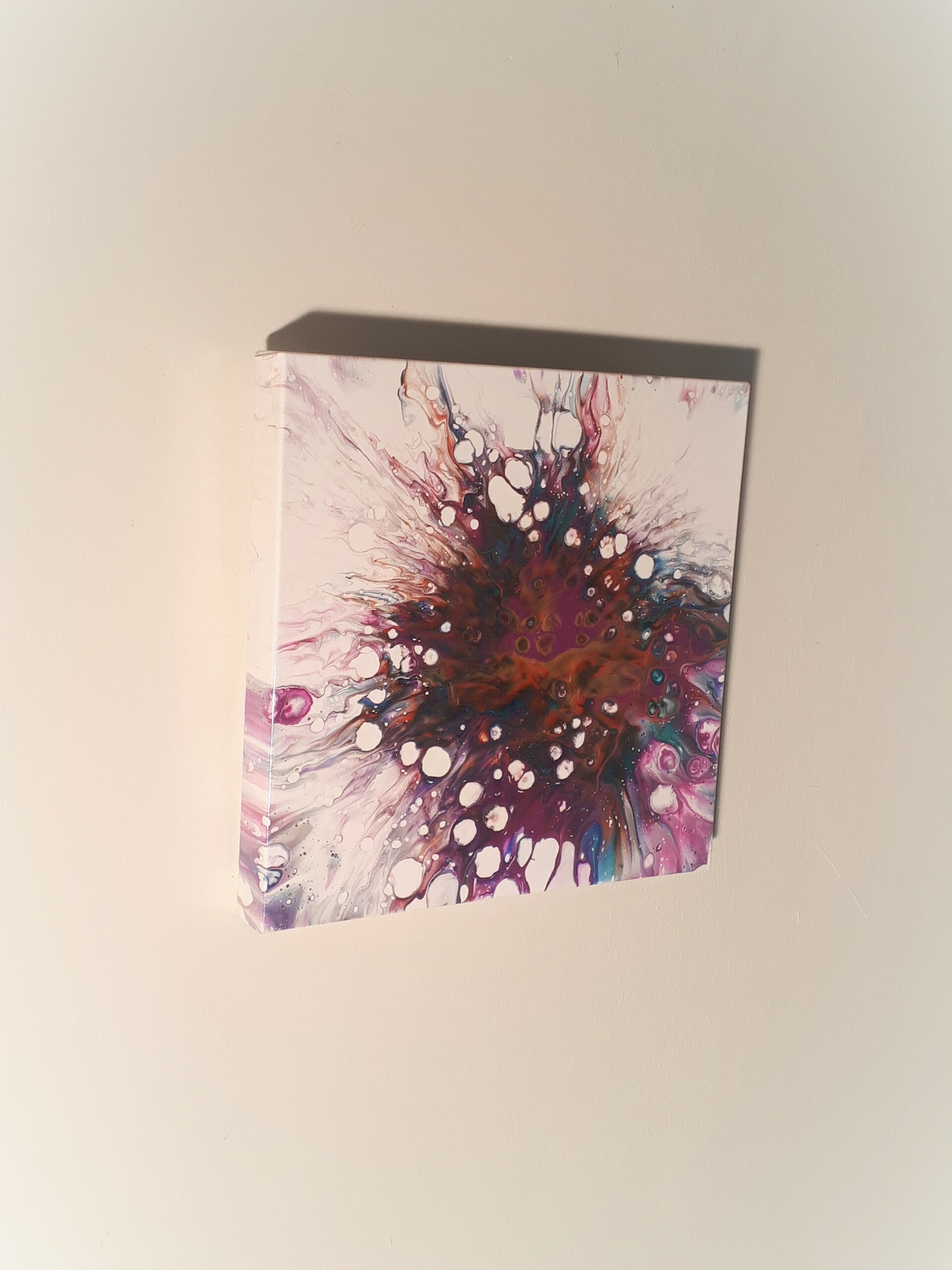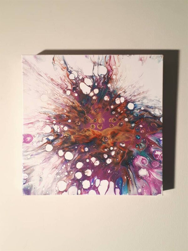 Cells and lacing come in many different styles, but sometimes with a Dutch pour, the colors look like they are literally exploding out from the center of the canvas. In my Fall 2020 collection I saw a cheetah and it's spots splattered across the canvas, but this year the colors reminded me of a peacock--who had an unfortunate accident. No animals were harmed in the pouring of this canvas.