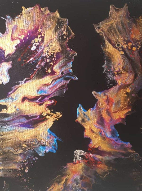 Colorful metallics dance across a black background like flames in the night on these playful canvases. These pieces are available individually but if you're interested in all three, send me a message and I will arrange a discount.