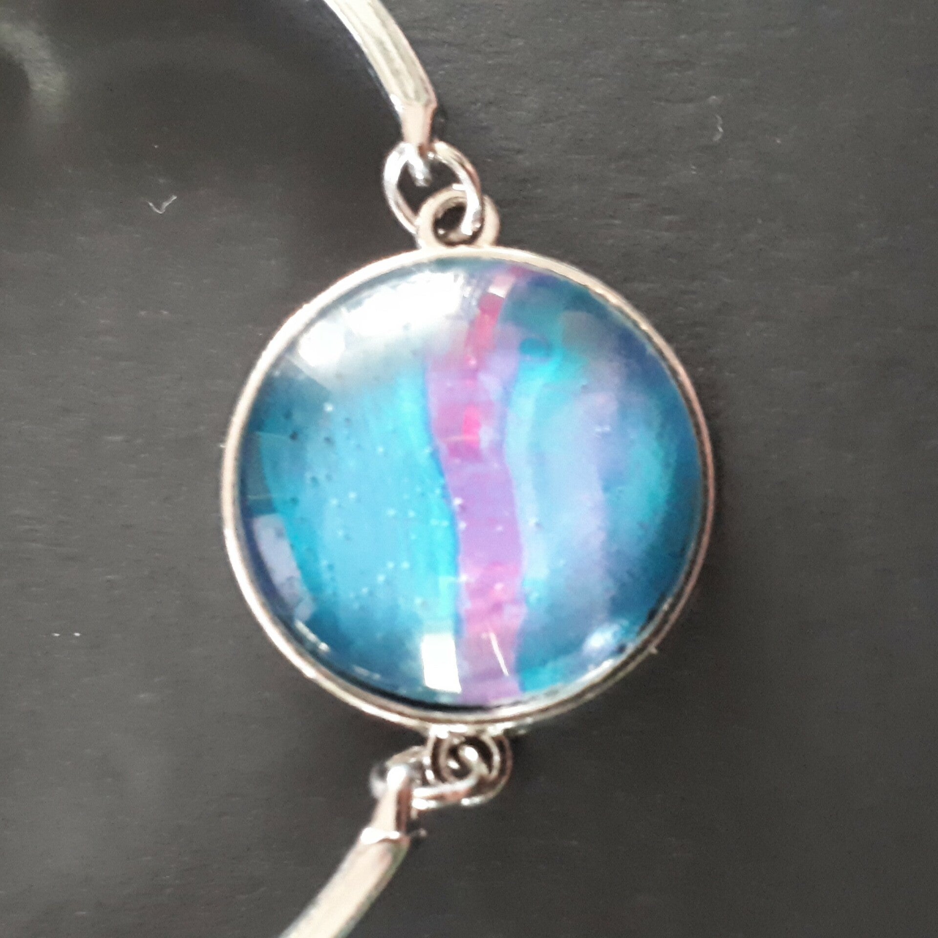 All of my jewelry is made using paint “skins”. When I make an Acrylic Pour painting, paint drips off my canvas onto my silicone mat. I then spread it and allow it to dry. When it is ready, I place cabochons (domed pieces of glass) on the skins till I find a section I like. I then glue the cabochon to the skin and after it dries, carefully cut it out. I then glue the cabochon into the bezel. The cabochon magnifies the skin and gives it a shine, creating a jewel-like effect. Each piece is one-of-a-kind.