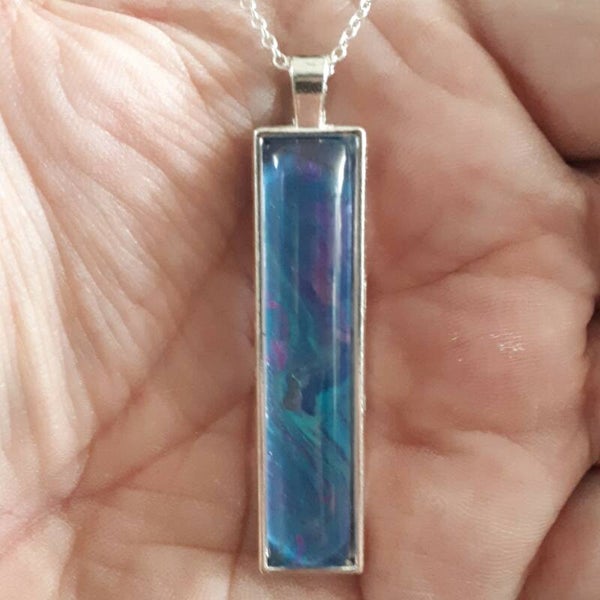 All of my jewelry is made using paint “skins”. When I make an Acrylic Pour painting, paint drips off my canvas onto my silicone mat. I then spread it and allow it to dry. When it is ready, I place cabochons (domed pieces of glass) on the skins till I find a section I like. I then glue the cabochon to the skin and after it dries, carefully cut it out. I then glue the cabochon into the bezel. The cabochon magnifies the skin and gives it a shine, creating a jewel-like effect. Each piece is one-of-a-kind.