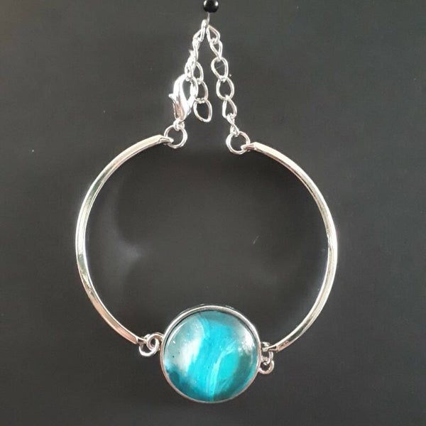 All of my jewelry is made using paint “skins”. When I make an Acrylic Pour painting, paint drips off my canvas onto my silicone mat. I then spread it and allow it to dry. When it is ready, I place cabochons (domed pieces of glass) on the skins till I find a section I like. I then glue the cabochon to the skin and after it dries, carefully cut it out. I then glue the cabochon into the bezel. The cabochon magnifies the skin and gives it a shine, creating a jewel-like effect. Each piece is one-of-a-kind.