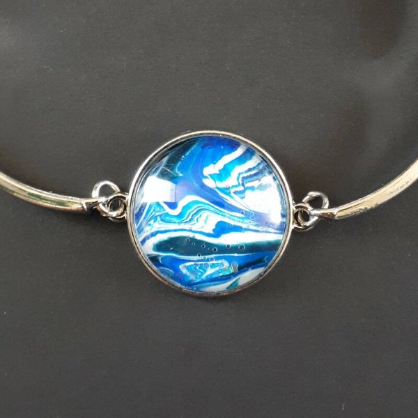All of my jewelry is made using paint “skins”. When I make an Acrylic Pour painting, paint drips off my canvas onto my silicone mat. I then spread it and allow it to dry. When it is ready, I place cabochons (domed pieces of glass) on the skins till I find a section I like. I then glue the cabochon to the skin and after it dries, carefully cut it out. I then glue the cabochon into the bezel. The cabochon magnifies the skin and gives it a shine, creating a jewel-like effect. Each piece is one-of-a-kind.
