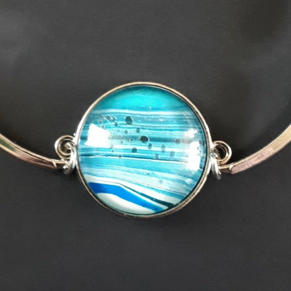 All of my jewelry is made using paint “skins”. When I make an Acrylic Pour painting, paint drips off my canvas onto my silicone mat. I then spread it and allow it to dry. When it is ready, I place cabochons (domed pieces of glass) on the skins till I find a section I like. I then glue the cabochon to the skin and after it dries, carefully cut it out. I then glue the cabochon into the bezel. The cabochon magnifies the skin and gives it a shine, creating a jewel-like effect. Each piece is one-of-a-kind.