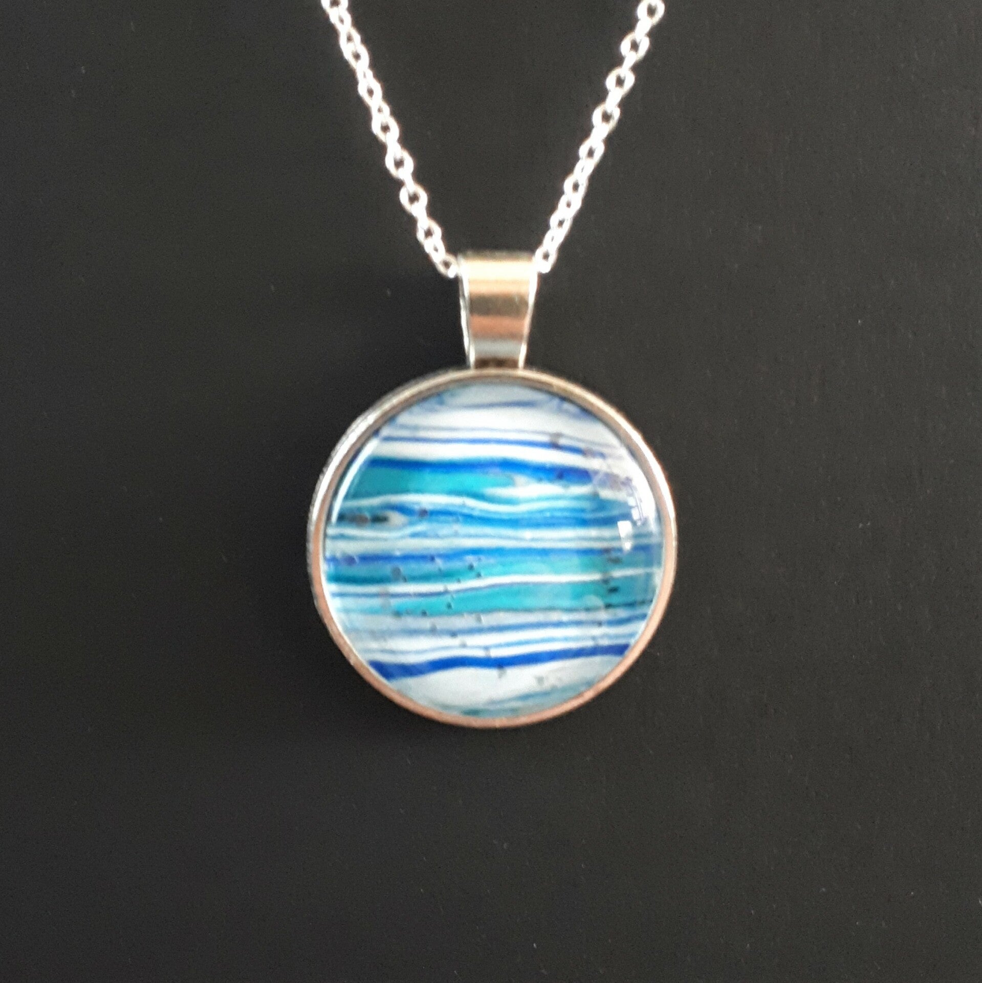 All of my jewelry is made using paint “skins”. When I make an Acrylic Pour painting, paint drips off my canvas onto my silicone mat. I then spread it and allow it to dry. When it is ready, I place cabochons (domed pieces of glass) on the skins till I find a section I like. I then glue the cabochon to the skin and after it dries, carefully cut it out. I then glue the cabochon into the bezel. The cabochon magnifies the skin and gives it a shine, creating a jewel-like effect. Each piece is one-of-a-kind.