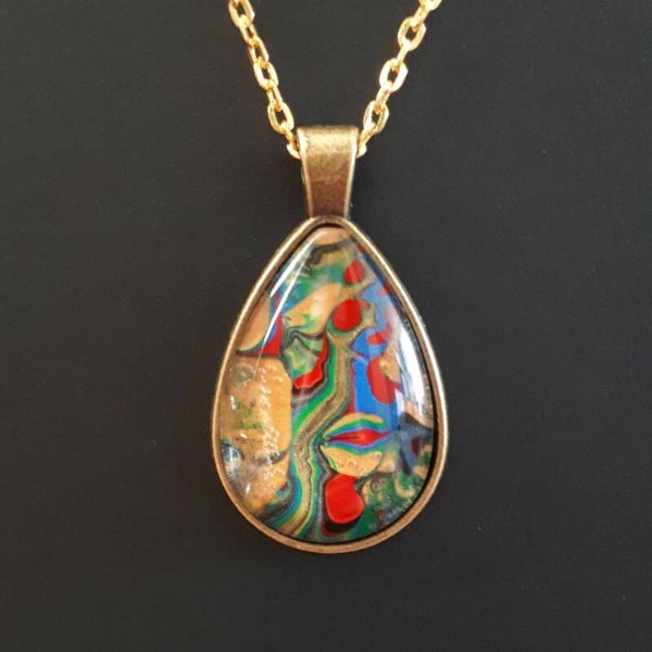 All of my jewelry is made using paint “skins”. When I make an Acrylic Pour painting, paint drips off my canvas onto my silicone mat. I then spread it and allow it to dry. When it is ready, I place cabochons (domed pieces of glass) on the skins till I find a section I like. I then glue the cabochon to the skin and after it dries, carefully cut it out. I then glue the cabochon into the bezel. The cabochon magnifies the skin and gives it a shine, creating a jewel-like effect. Each piece is one-of-a-kind.