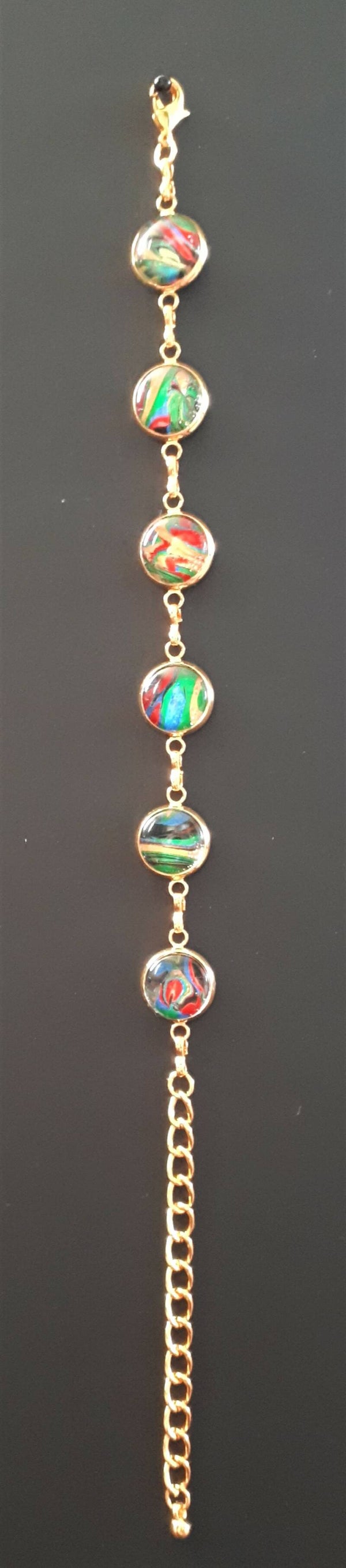 All of my jewelry is made using paint “skins”. When I make an Acrylic Pour painting, paint drips off my canvas onto my silicone mat. I then spread it and allow it to dry. When it is ready, I place cabochons (domed pieces of glass) on the skins till I find a section I like. I then glue the cabochon to the skin and after it dries, carefully cut it out. I then glue the cabochon into the bezel. The cabochon magnifies the skin and gives it a shine, creating a jewel-like effect. Each piece is one-of-a-kind.