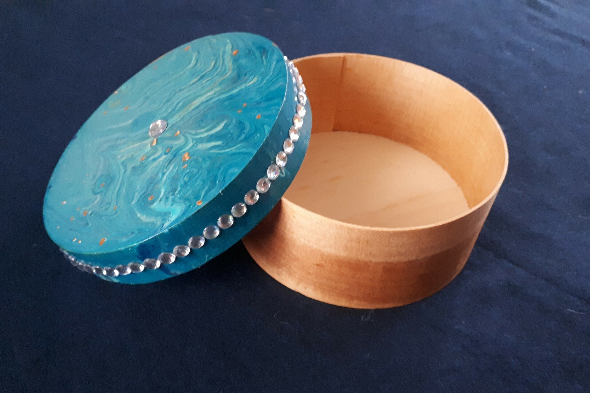 This round, light-weight bamboo box is perfect for storing small items. The lid has a beautiful blue pour and is embellished with one tiny jewel on the top and a jewelled border around the edge. The base has been kept natural bamboo. A lovely one-of-a-kind gift.