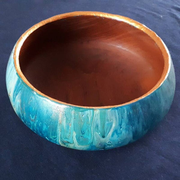 This once simple bowl made of jujube wood has been transformed with an ocean colored acrylic pour on the outside, and a simple, hand-painted golden rim. The inside of the bowl has been left natural. This outside has been varnished so while you can easily clean out the inside with soap and water, it is not dishwasher safe. Perfect for cookies, candy or potpourri.